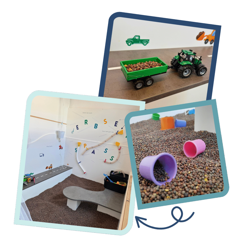 Das Herzstück unseres Abenteuerraums ist das 2,8 m2 große Erbsenbad – die “Sandkiste” für drinnen. Es lädt zum Spielen und Wahrnehmen ein und bietet viele Fördermöglichkeiten für die Feinmotorik, die Spielentwicklung und die Körperwahrnehmung. Schütten, Kochen, Transportieren, sich oder Gegenstände vergraben – der Fantasie sind kaum Grenzen gesetzt.